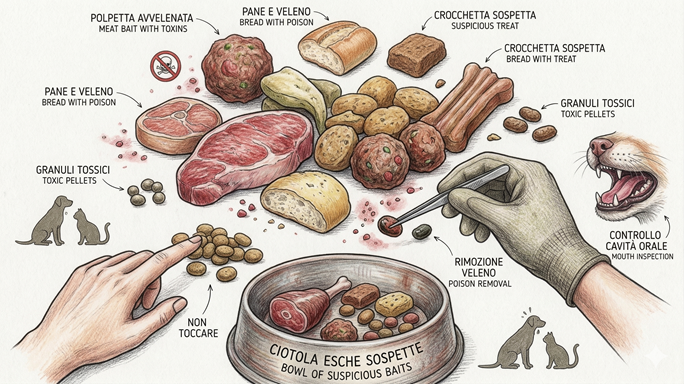 E’ fatto divieto a chiunque di utilizzare impropriamente, così come di preparare, miscelare e abbandonare esche avvelenate o contenenti sostanze dannose o tossiche, compreso vetro, plastica o materiale esplodente in grado di provocare la morte o lesioni al soggetto che le ingerisce. Per la tutela dell’incolumità e della salute pubblica, compresa quella degli animali, è vietato anche detenere, utilizzare e abbandonare alimenti che possono, se ingeriti, provocare intossicazioni o lesioni.