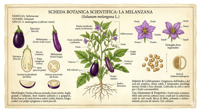 La melanzana (Solanum melongena L.) è una pianta erbacea, eretta, alta da 30 cm a poco più di un metro. I fiori grandi, solitari, sono violacei o anche bianchi. I frutti sono bacche grandi, allungate o rotonde, normalmente nere, commestibili dopo la cottura.