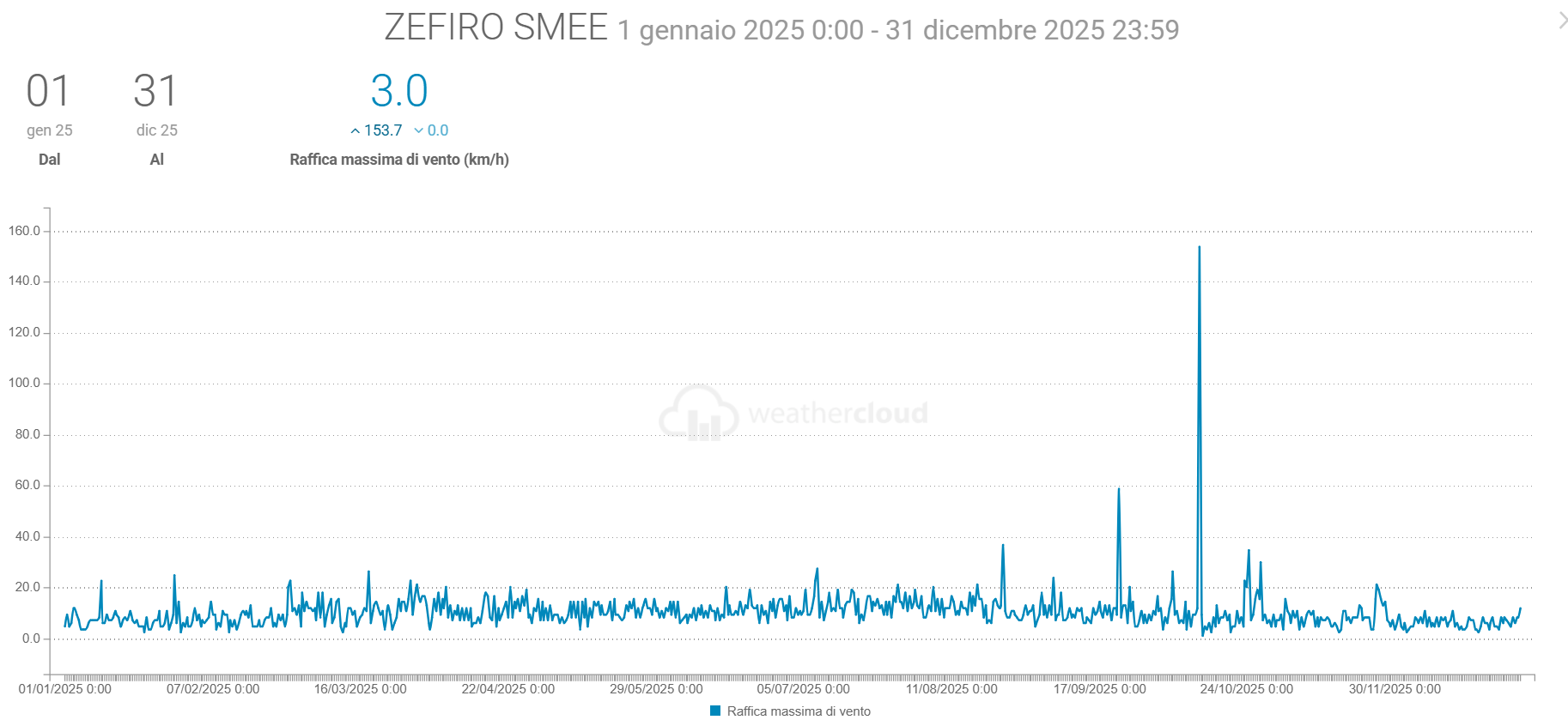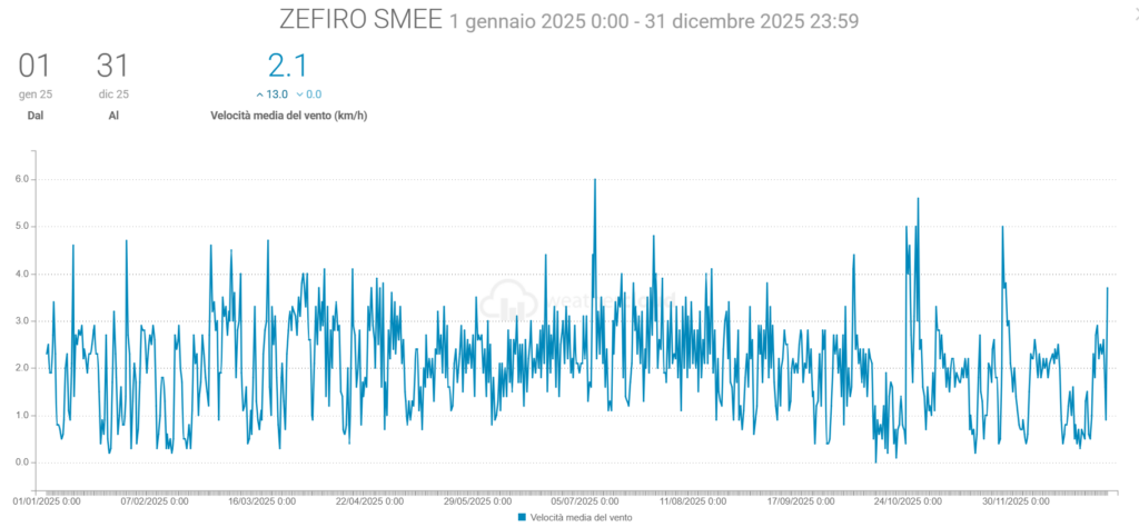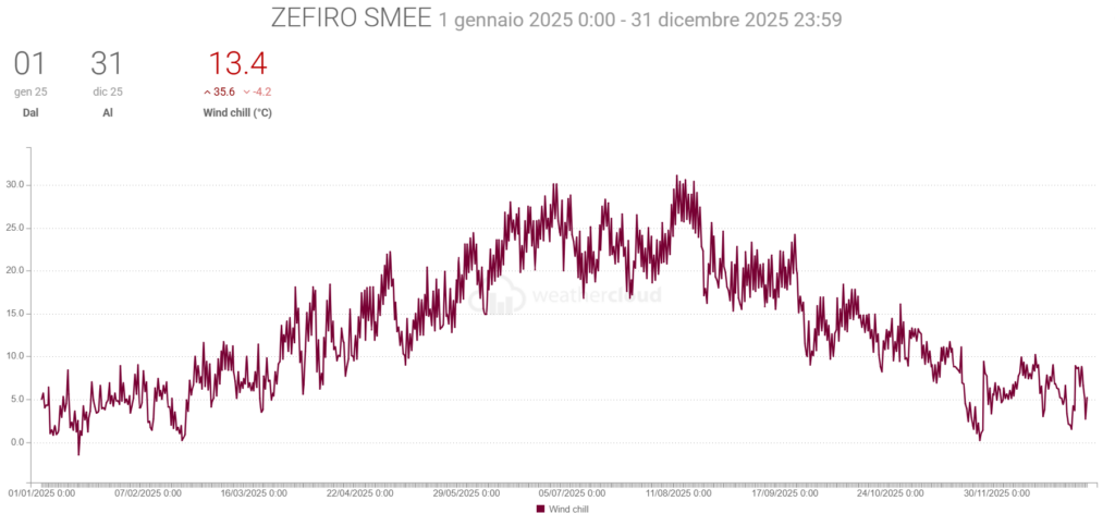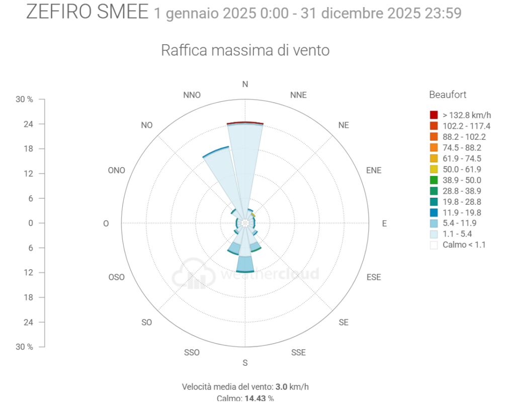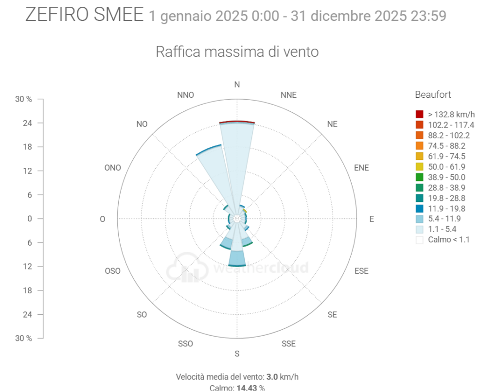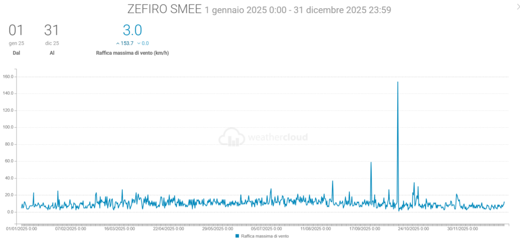 - La Velocità media del vento è scesa di 0,1 km/h mentre la raffica massima è stata di 153,7 km/h (ben oltre quella di 36,7 km/h del 2024)