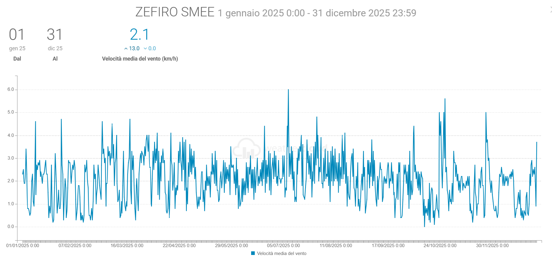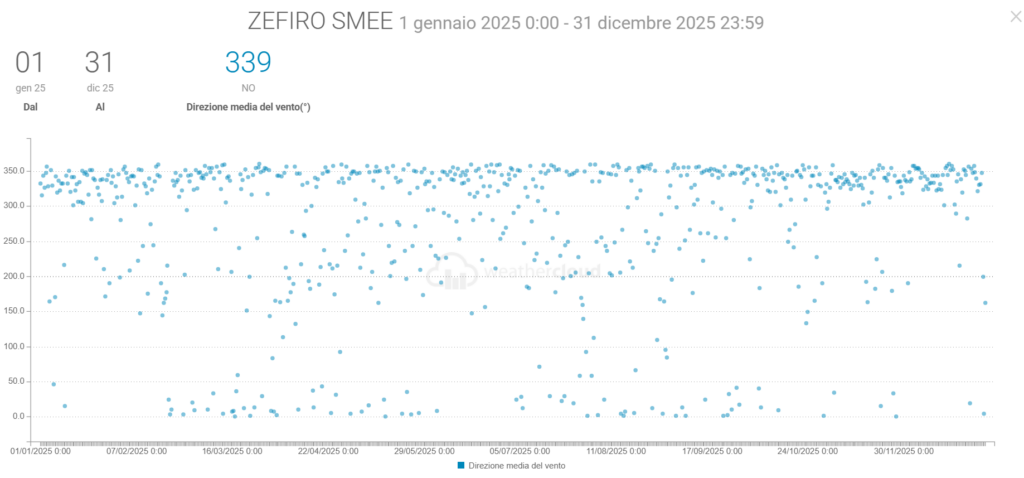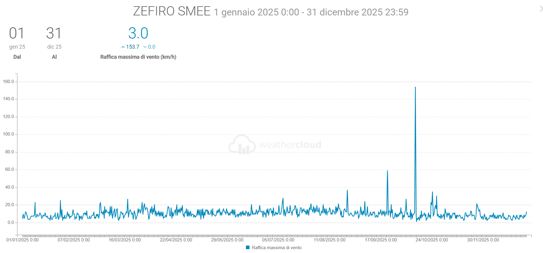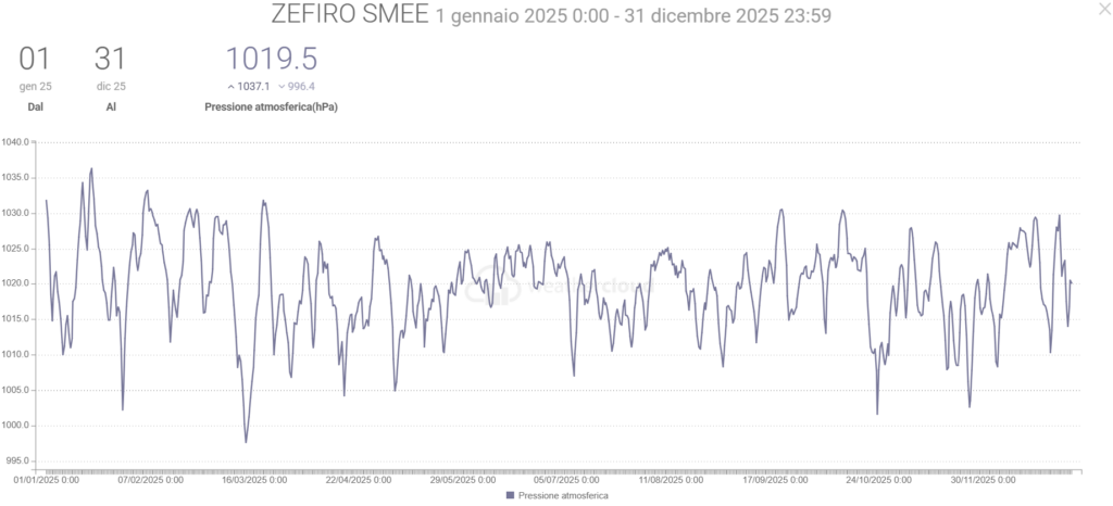 - La Velocità media del vento è scesa di 0,1 km/h mentre la raffica massima è stata di 153,7 km/h (ben oltre quella di 36,7 km/h del 2024)