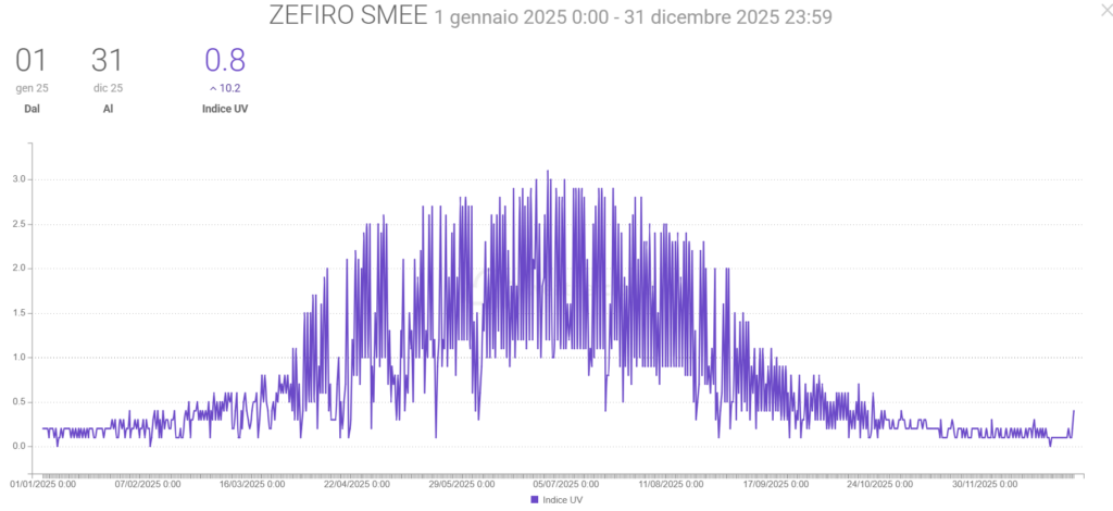 - L’Indice UV medio 0,8 con picchi di 10,2, uguale al 2024.