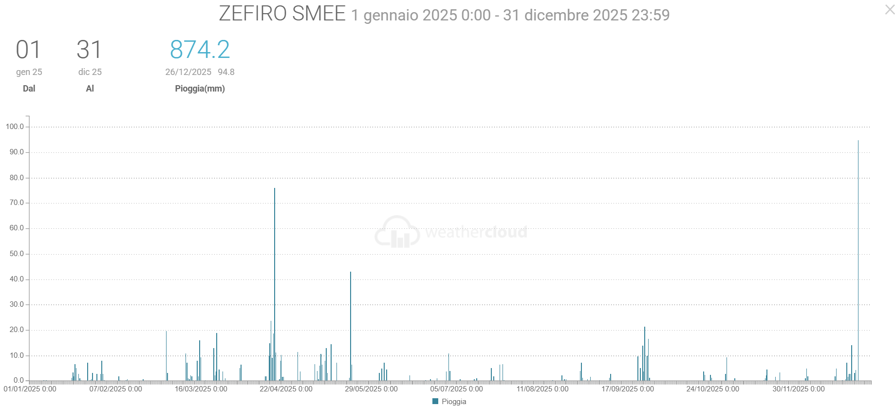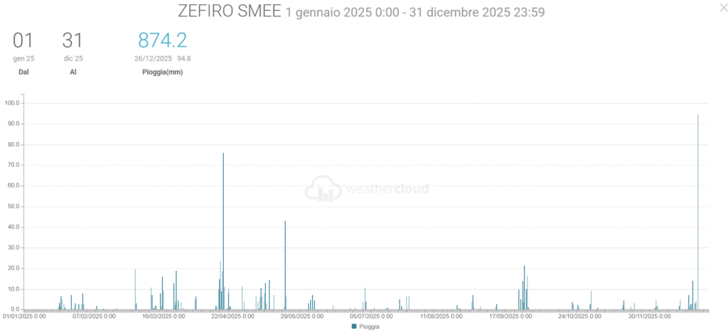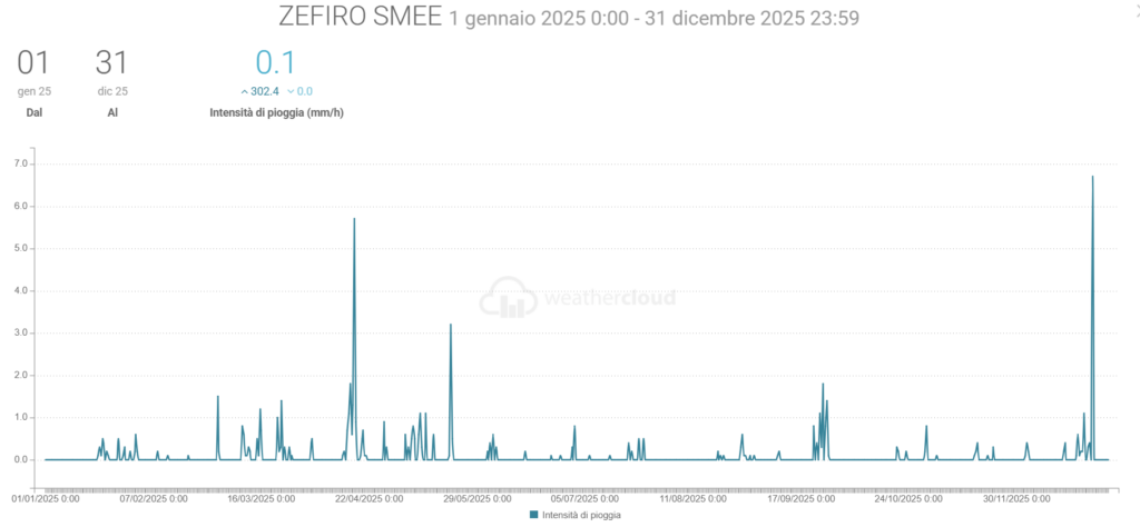 - Pioggia: ha piovuto 874,2 mm (quasi metà rispetto ai 1556,2 mm del 2024) ma con intensità eccezionale come i 302,4 mm/h di metà aprile (quando ci sono state le frane. L’anno prima il picco è stato 68,4 mm/h)