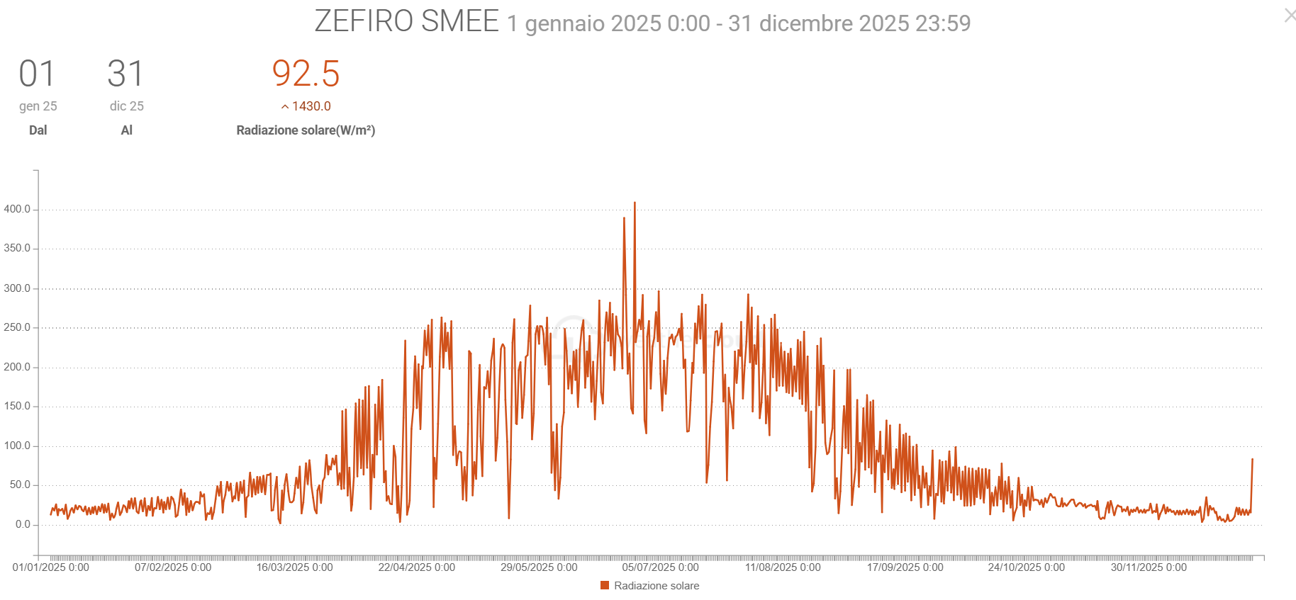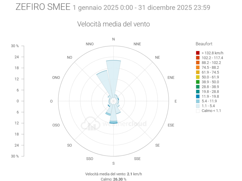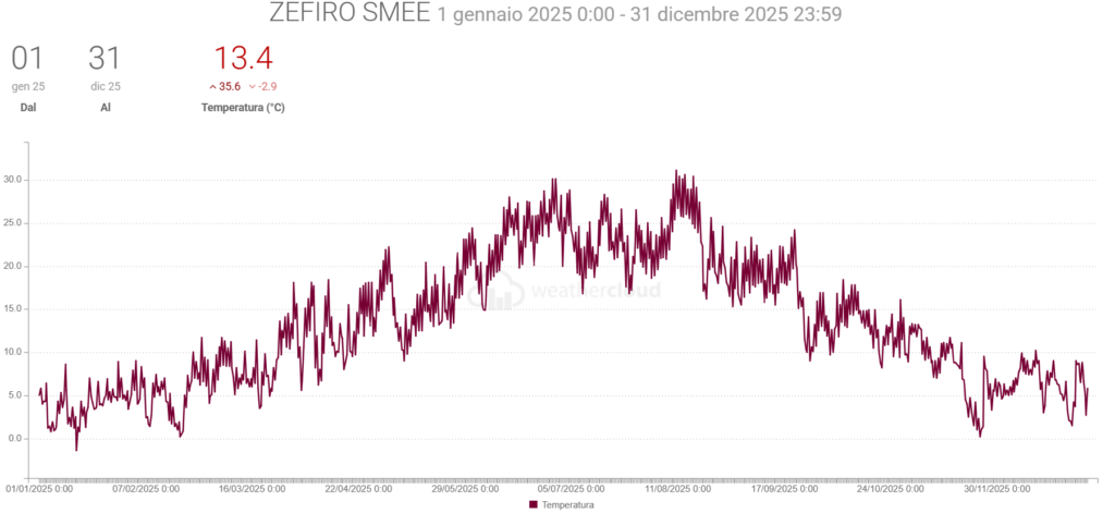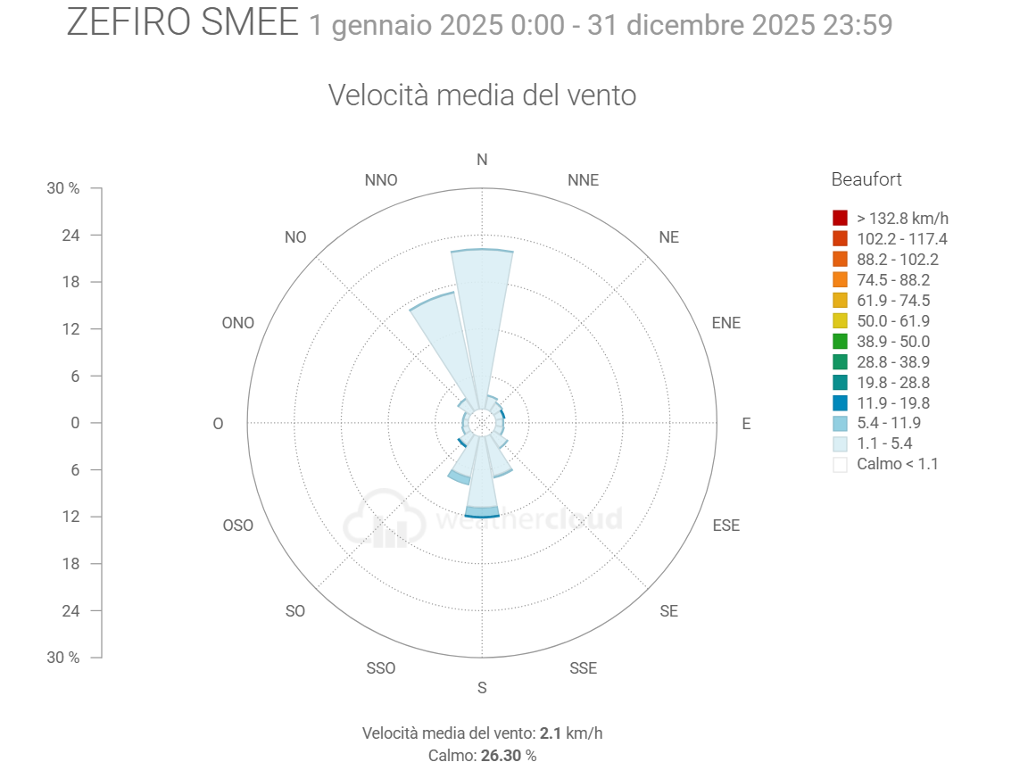 - La Radiazione solare media è stata di 1,4 W/m2 in più del 2024 con picco di 1430,0 (uguale al picco dell’anno prima)