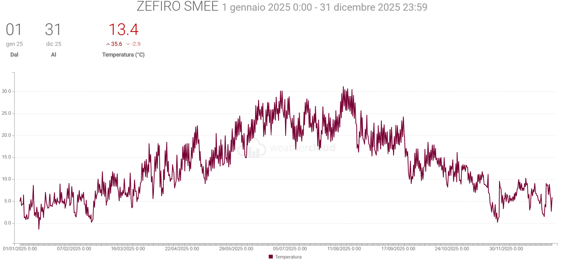 - Temperatura media 13,4°C (quindi -0,8°C rispetto al 2024, ma la massima è stata maggiore di +2°C e la minima ancor più bassa di 1,1°C. Vero che non ho i dati di gennaio 2024).