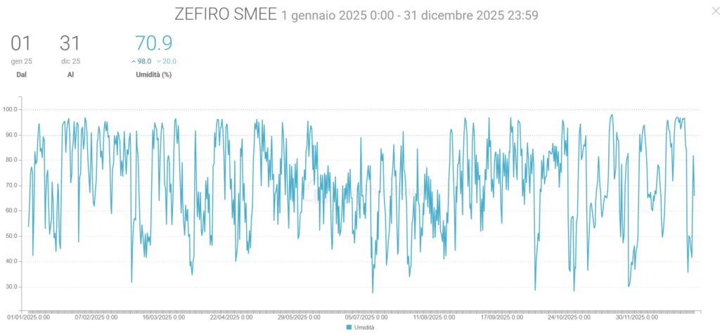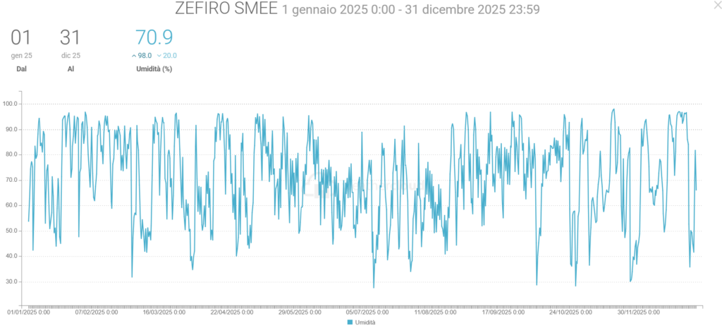 - L’Umidità media è cresciuta del 0,2%. L’umidità minima è salita del 9% da 11% a 20% nel 2025.