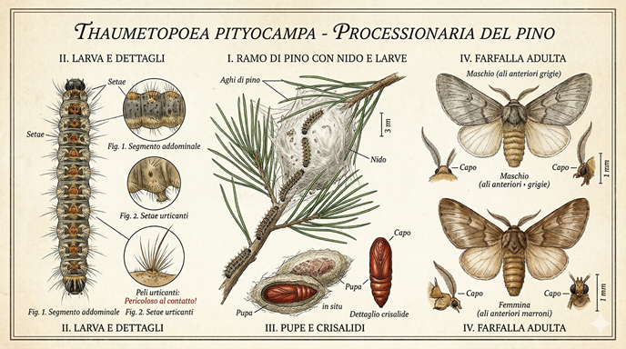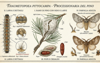 Il nome di questo bruco peloso non è stato scelto a caso ma ha un suo perché ben preciso, questo animaletto all’apparenza innocuo, ha l’abitudine di muoversi dietro ad un compagno, tutti in fila, lentamente, proprio come in una processione. La processionaria è un bruco pericolosissimo che si trasforma poi in falena una volta adulta. I suoi nidi si trovano principalmente su pini, abeti o altre conifere ma non disdegna anche altri tipi di piante, delle quali si nutre fino a distruggerle. Sulle querce è possibile osservare questo gruppo di bruchi che invece di procedere in fila indiana si dispone a ventaglio con due bruchi in testa [...]