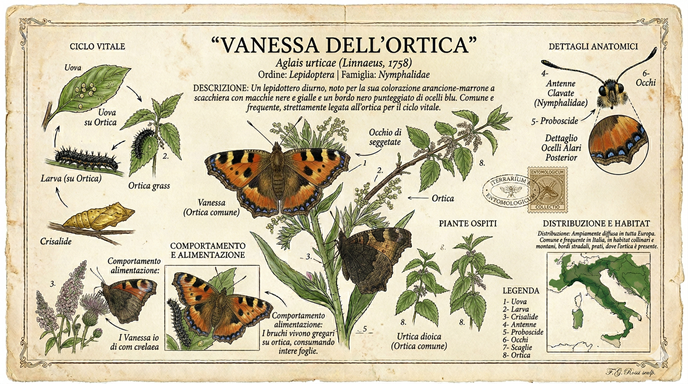 La livrea di questa comune farfalla europea è vivacemente colorata di rosso arancio con chiazze gialle e nere sulle ali anteriori. Sul margine delle ali si estendono inoltre una serie di macchie azzurre. Ha un’apertura alare di 44,5 cm e appartiene alla famiglia dei Nymphalidae. Come dice il nome, la pianta ospite della larva è l’ortica. Frequenta ambienti fioriti, soprattutto ai lati dei sentieri e dei prati incolti di bassa quota. Questa farfalla viene spesso attirata dai fori ricchi di nettare come quelli della buddleia.