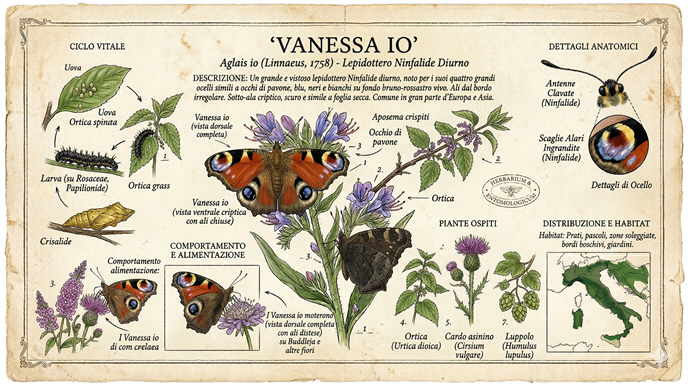 Le piante ospiti della larva della Vanessa sono il luppolo e l’ortica. Il bruco di questa farfalla è nero e spinoso, assai meno attraente dell’adulto. È facile incontrarla in gran parte delle pianure temperate d’Europa; dai prati, ai giardini e ai margini dei boschi. La livrea di questa farfalla è unica. Rosso bruno sullo sfondo e vivaci macchie ocellate in primo piano, utili a sviare gli attacchi degli uccelli. L’apertura alare può raggiungere 6-7 cm.