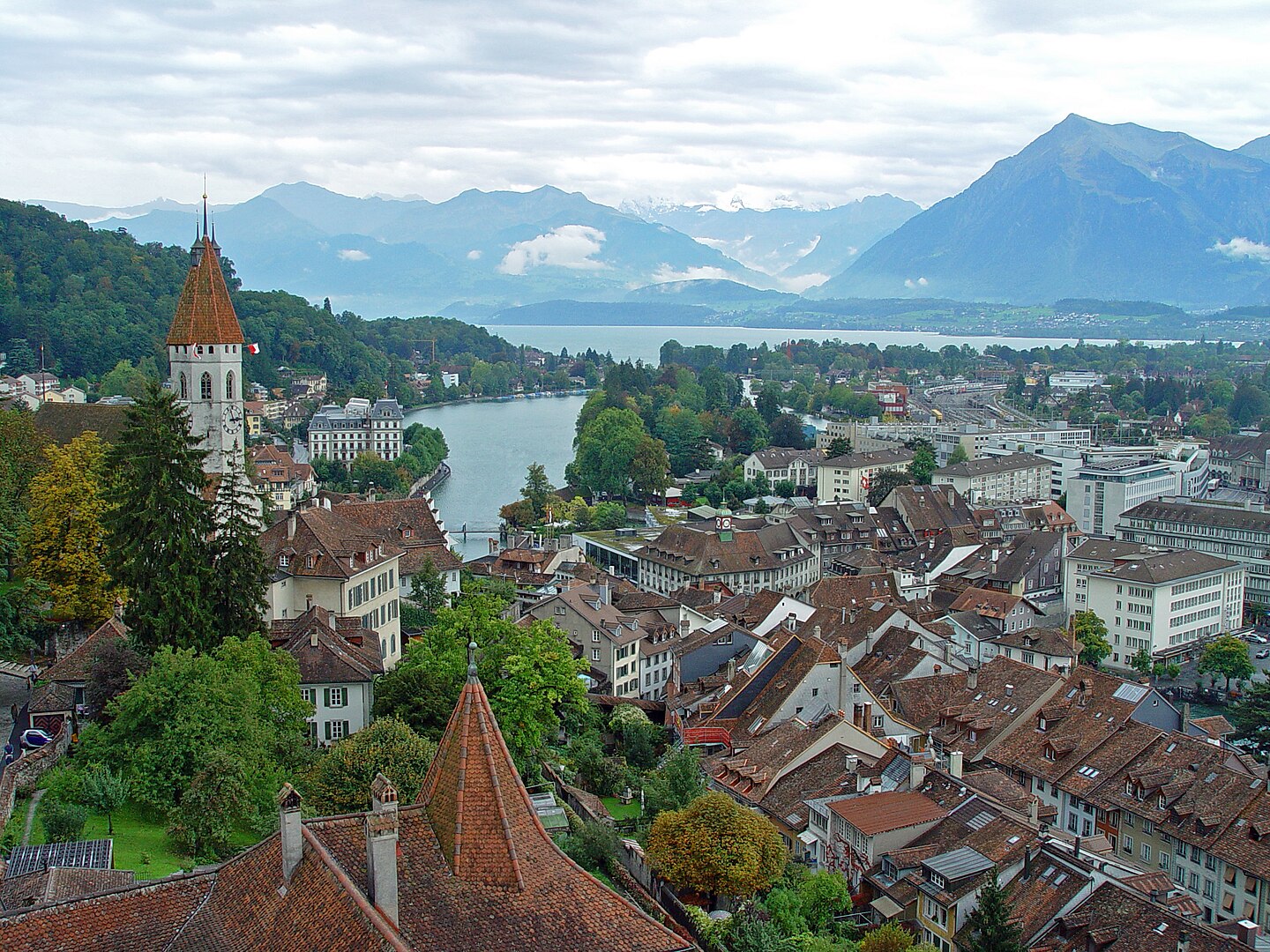 La città sorge nel punto in cui il fiume Aar fuoriesce dal Lago di Thun, 30 km circa a sud di Berna.